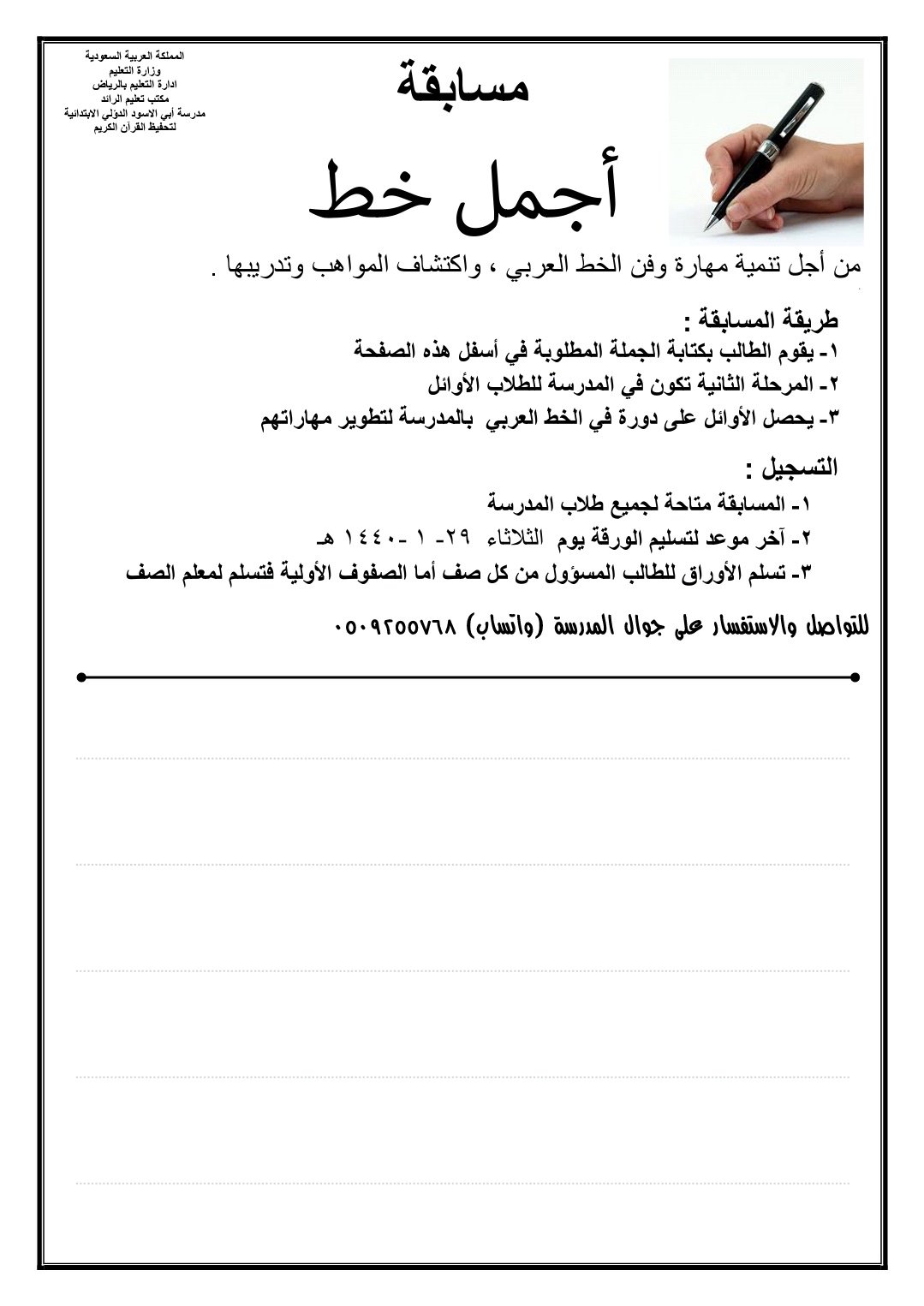 تحفيظ أبي الأسود الدؤلي الابتدائية On Twitter انطلق اليوم في المدرسة مسابقتين ١ مسابقة أجمل ترتيل ٢ مسابقة أجمل خط لإبراز المواهب في هذين المجالين وتنميتها