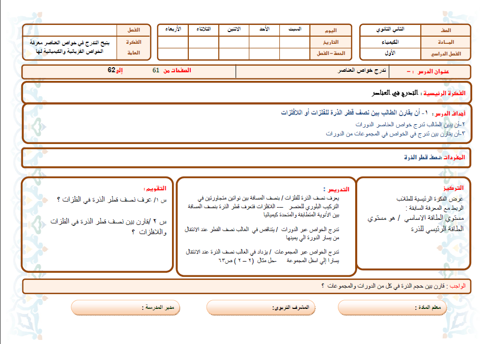 كيمياء ثاني ثانوي الفصل الثاني الجدول الدوري والتدرج في خواص العناصر