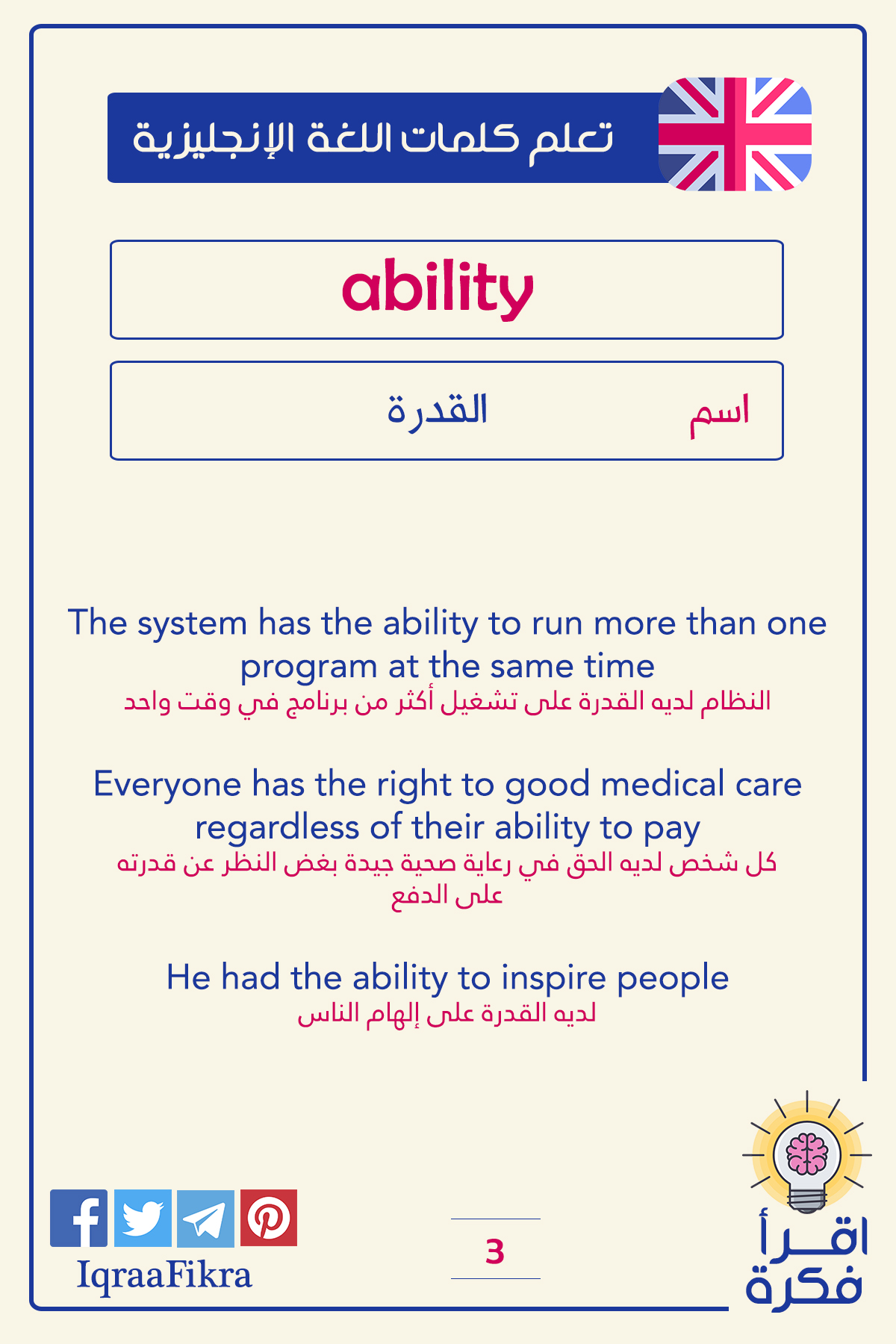 معنى وترجمة كلمة Ability باللغة العربية وبعض الأمثلة عليها مع معانيها